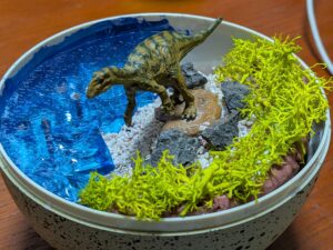 恐竜博物館のバス停横にあったお土産のケースが卵型で面白かったので、ジオラマの土台に使ってみました。材料はこんな感じです。作りながら足したものもあります。 まずは重心がしっかりするよう底石をボンドでくっつけます。粘土が少な […]