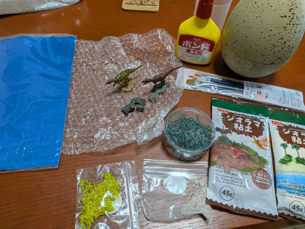 恐竜博物館のバス停横にあったお土産のケースが卵型で面白かったので、ジオラマの土台に使ってみました。材料はこんな感じです。作りながら足したものもあります。