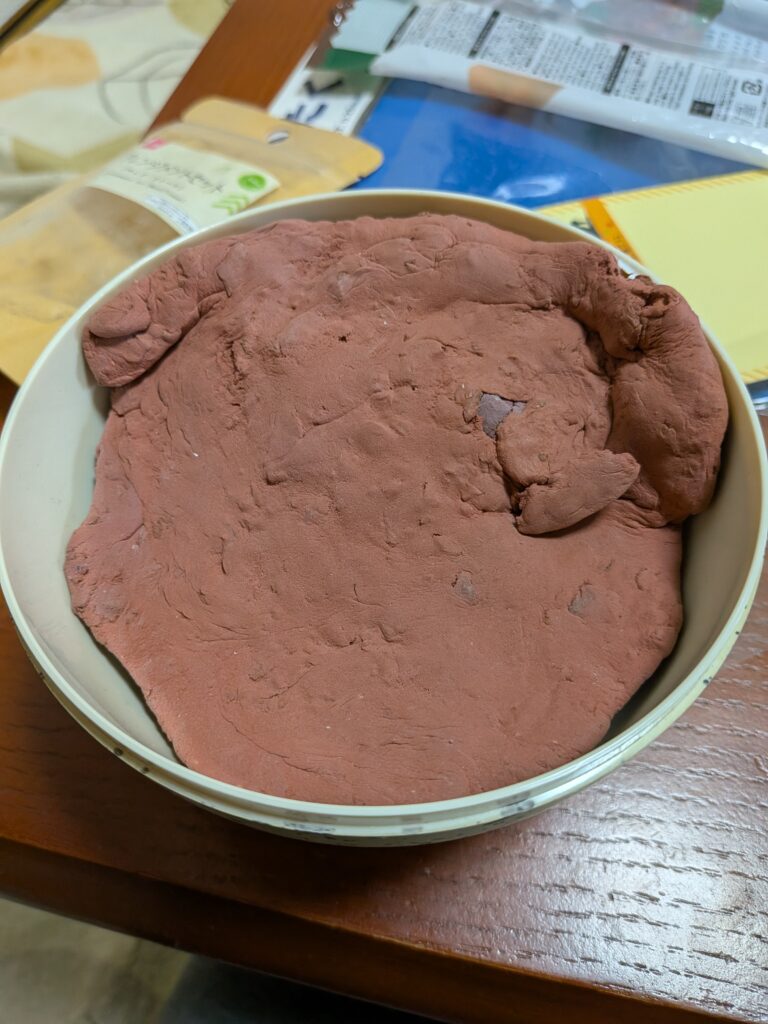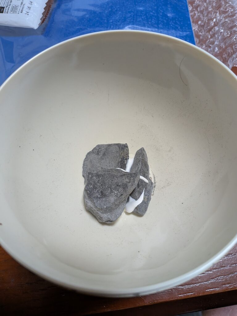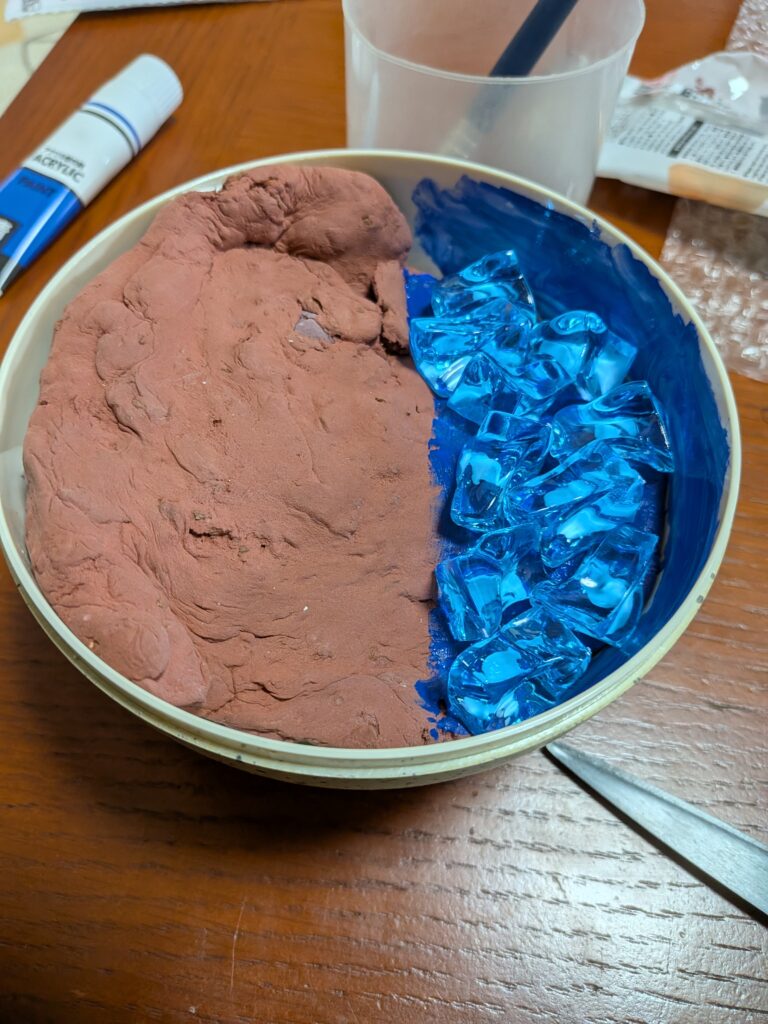 まずは重心がしっかりするよう底石をボンドでくっつけます。粘土が少なかったので底上げの役割もしています。その上に粘土をなるべくケースの側面まで来るよう伸ばして上にくっつけます。川を作りたかったので、少し傾斜をつけます。