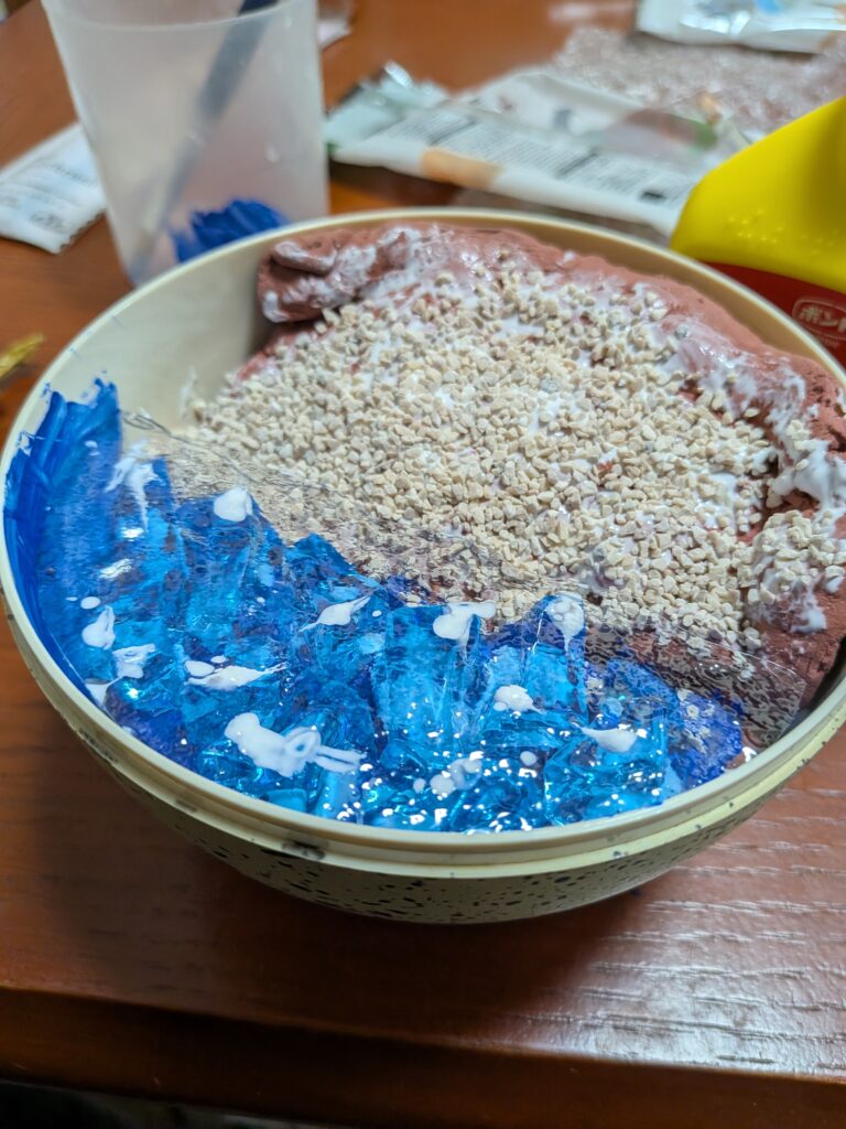 次に川になる部分を青く塗り、青色の石を敷き詰めていきます。その上から波紋のプラスチック板を乗せます。ガタついたので、最終的に青く塗ったつまようじを柱にしています。そして陸地は全体的に白いサンゴ石を敷き詰めます。