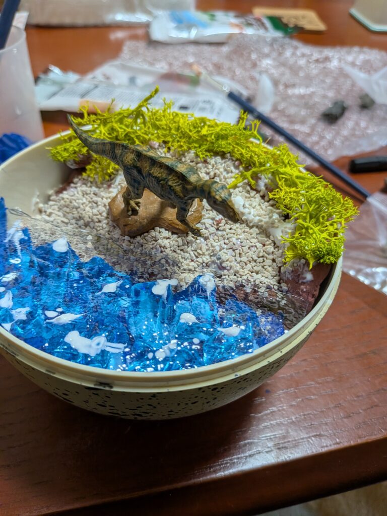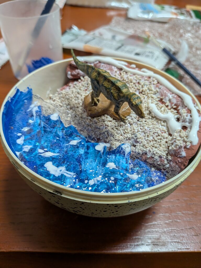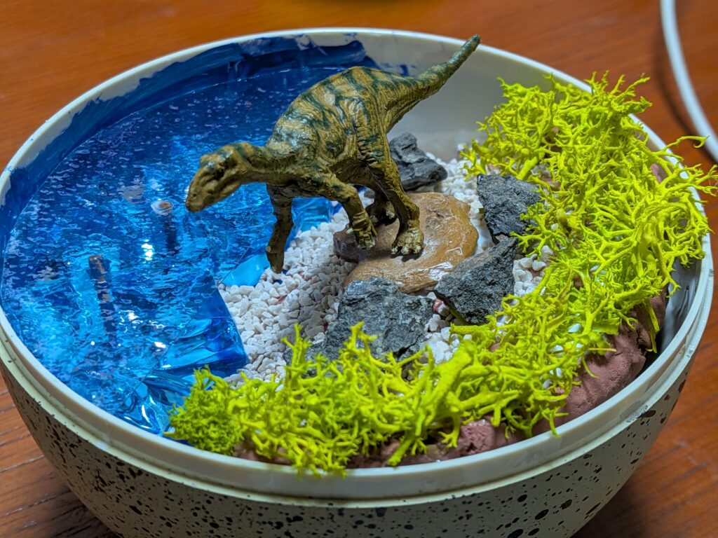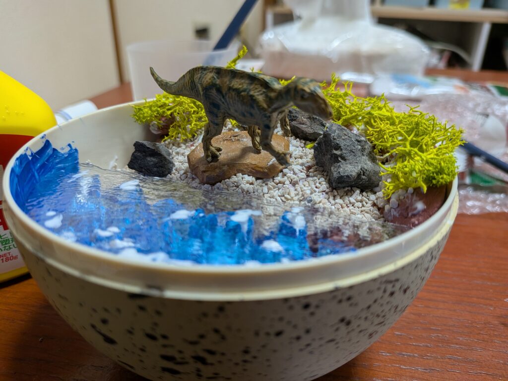 最後にフィギュアの周りに発掘体験で持ち帰った福井の化石を配置します。他のフィギュアで作っても良かったのですが、発掘体験の石を活用したかったので、福井で見つかった恐竜のフィギュアで作ってみました。